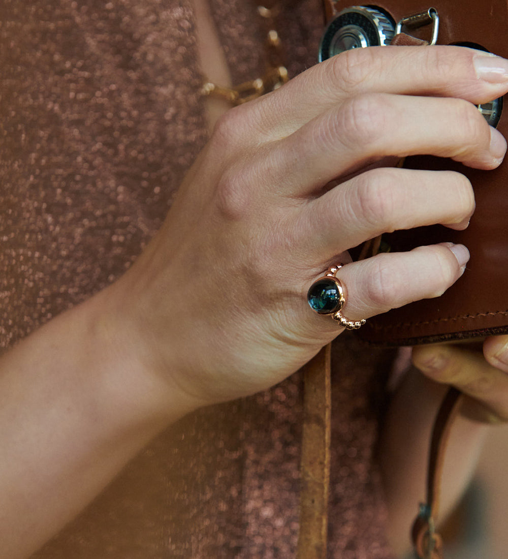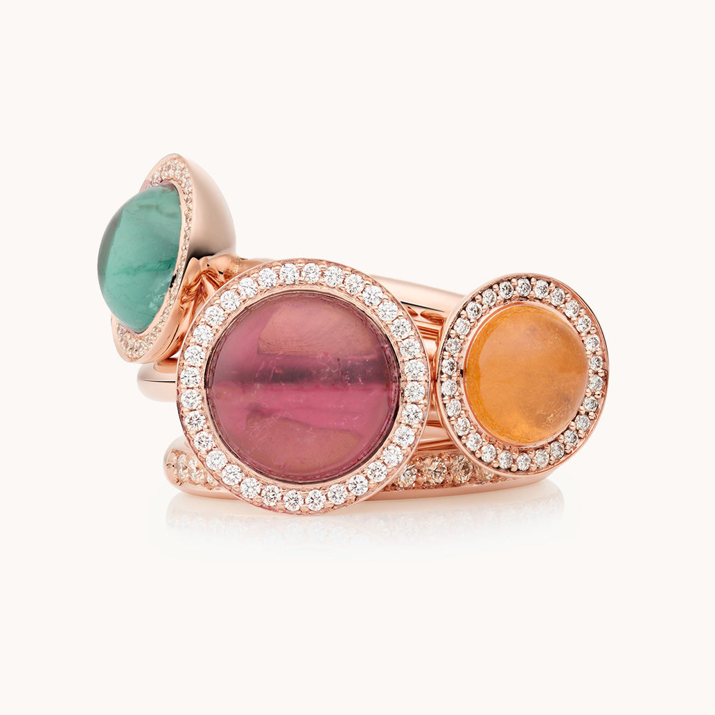 Variatie van vorm, kleur en afmeting is het kenmerk van onze Sushi familie. Constante factor is de krachtige zetting die de edelsteen inpakt in goud. Door haar verschillende vormen combineert Sushi ideaal met andere ringen. Maar ook als solitair heeft zij genoeg persoonlijkheid.