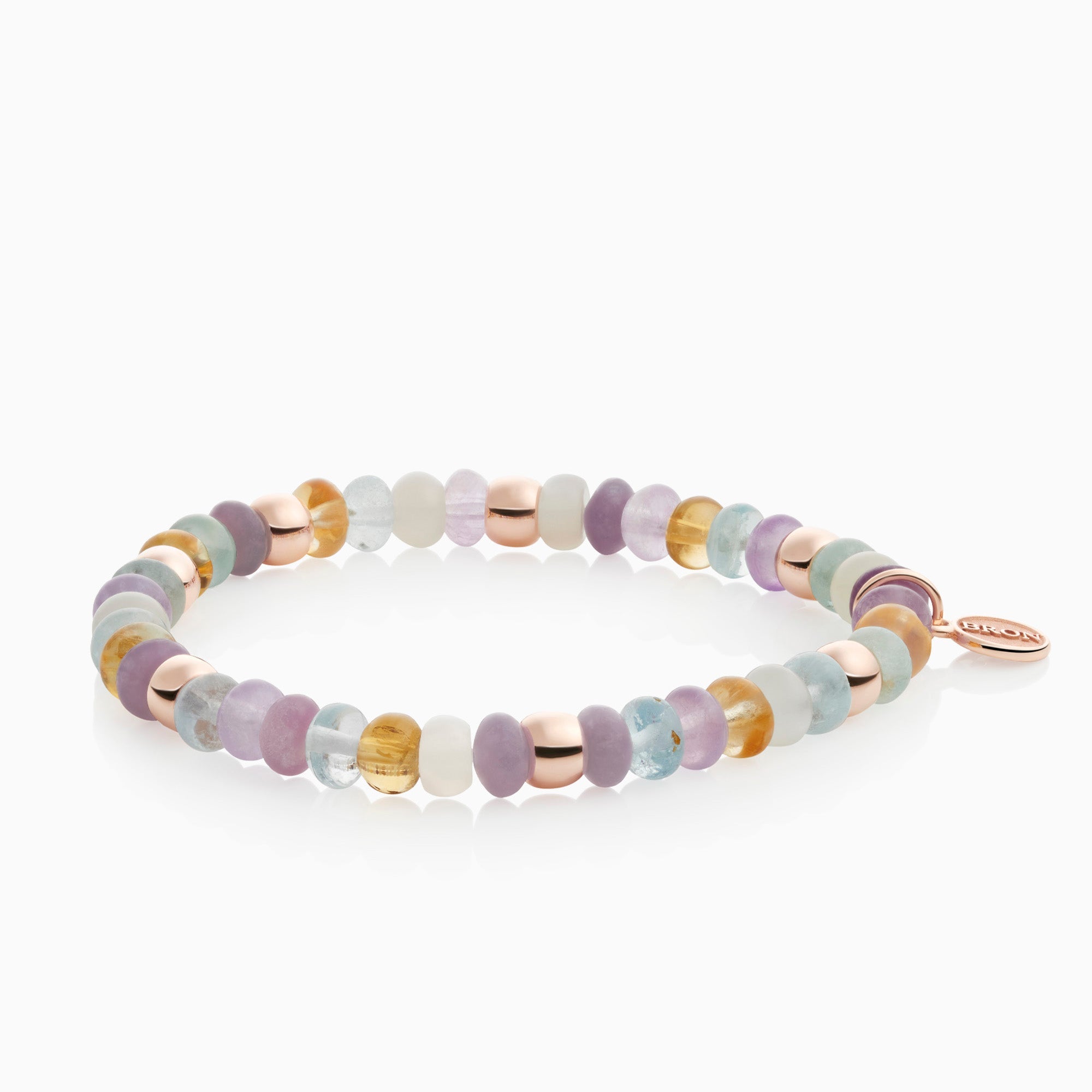 Deze edelstenen armband met 7 gouden ornamentjes en Bron label past precies bij de nieuwe ijspastel kleuren van 2024. Gelimiteerde oplage!