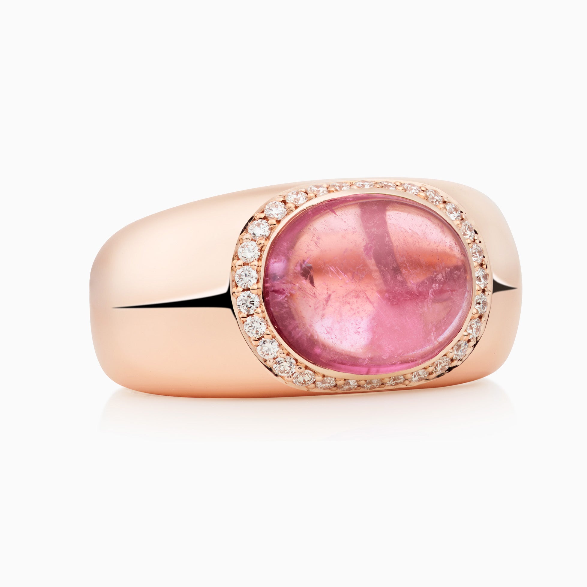 Goud heeft een hoog soortelijk gewicht. Dat voel je heel goed als je deze stoere, massieve ring met cabochon toermalijn om je vinger schuift. Lekker zwaar, en door de modellering tegelijkertijd heel draagbaar. Rondom de steen een randje van witte diamant.