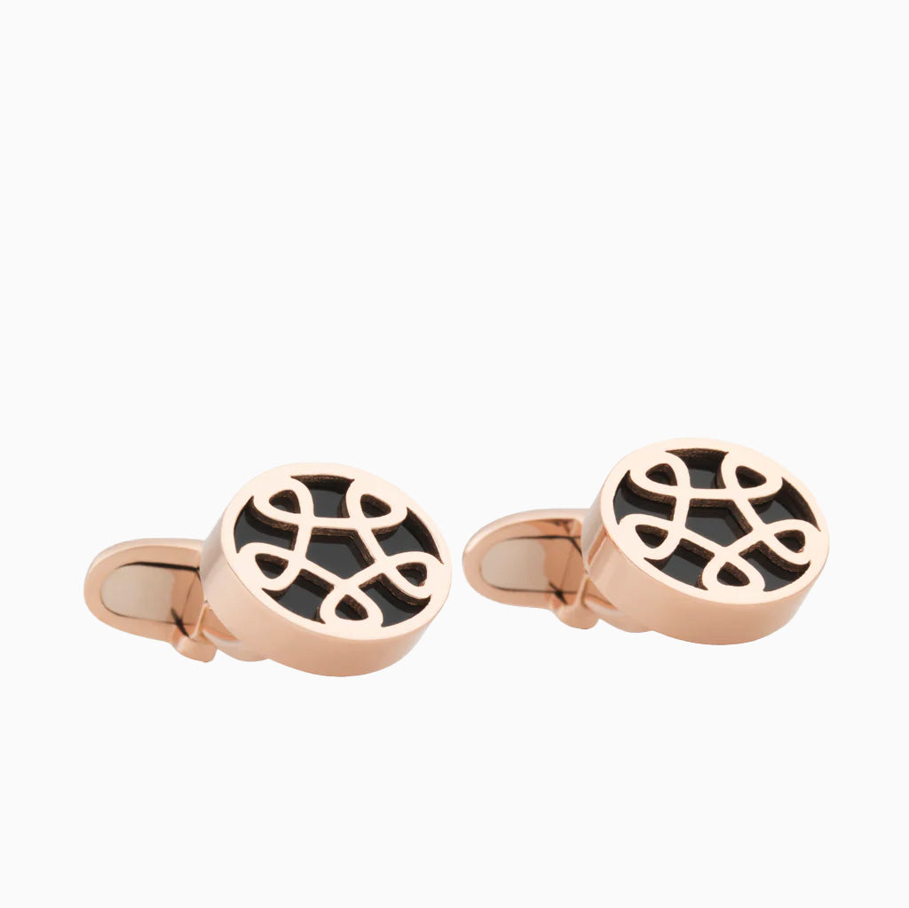 Het Toujours Ajour motief boven een onyx plaatje verwerkt in manchetknopen. Voor heren met durf en stijl.